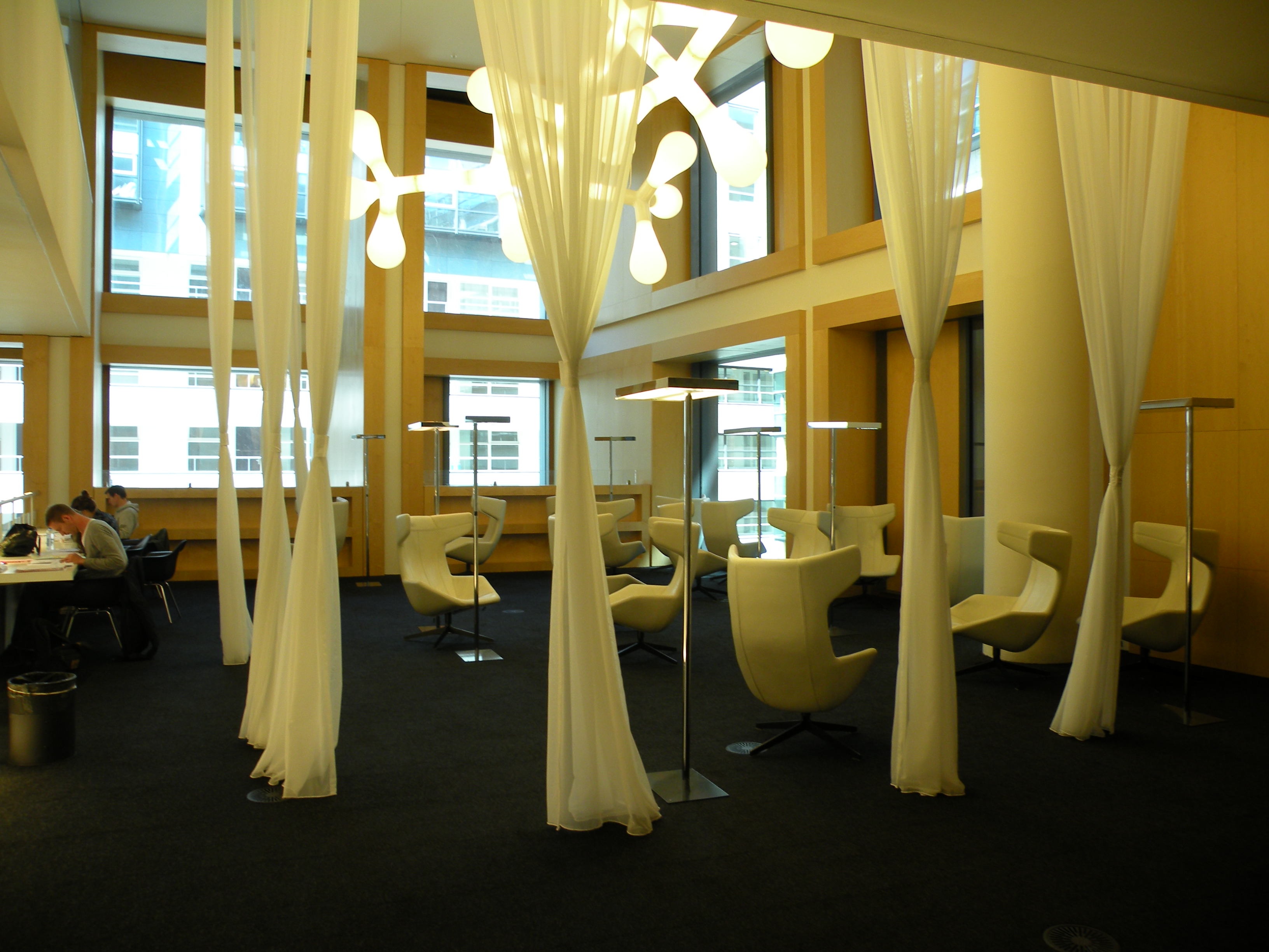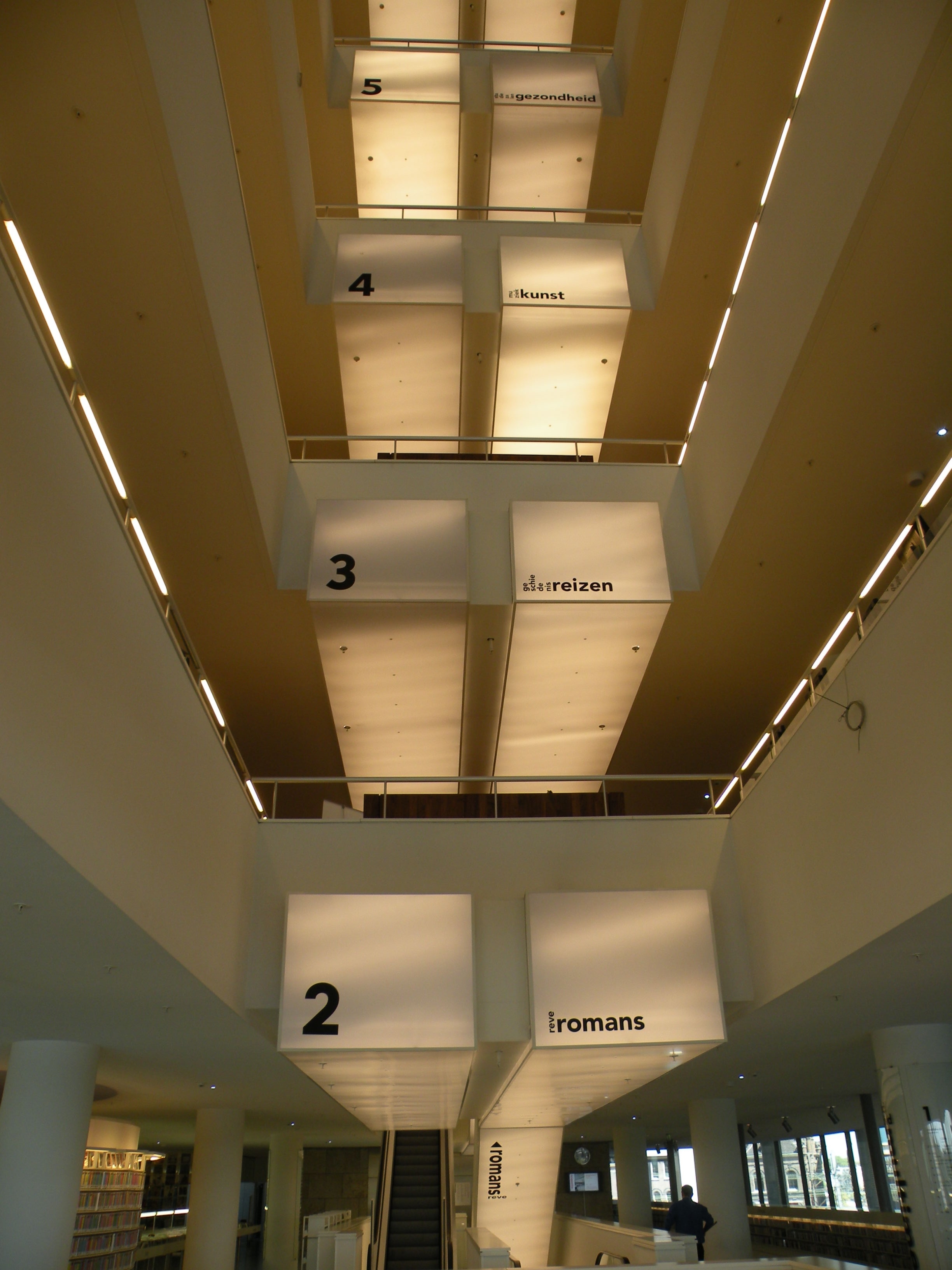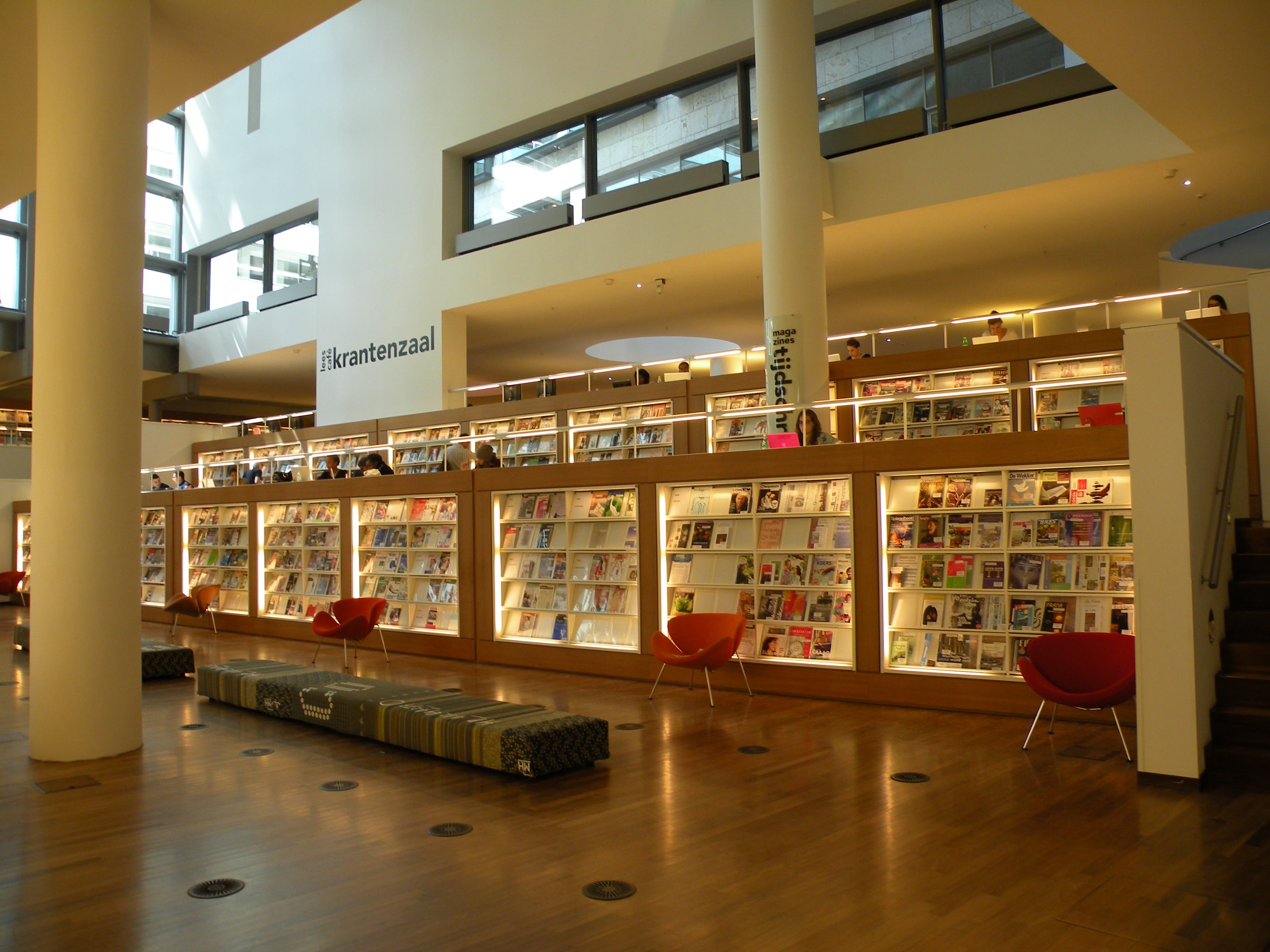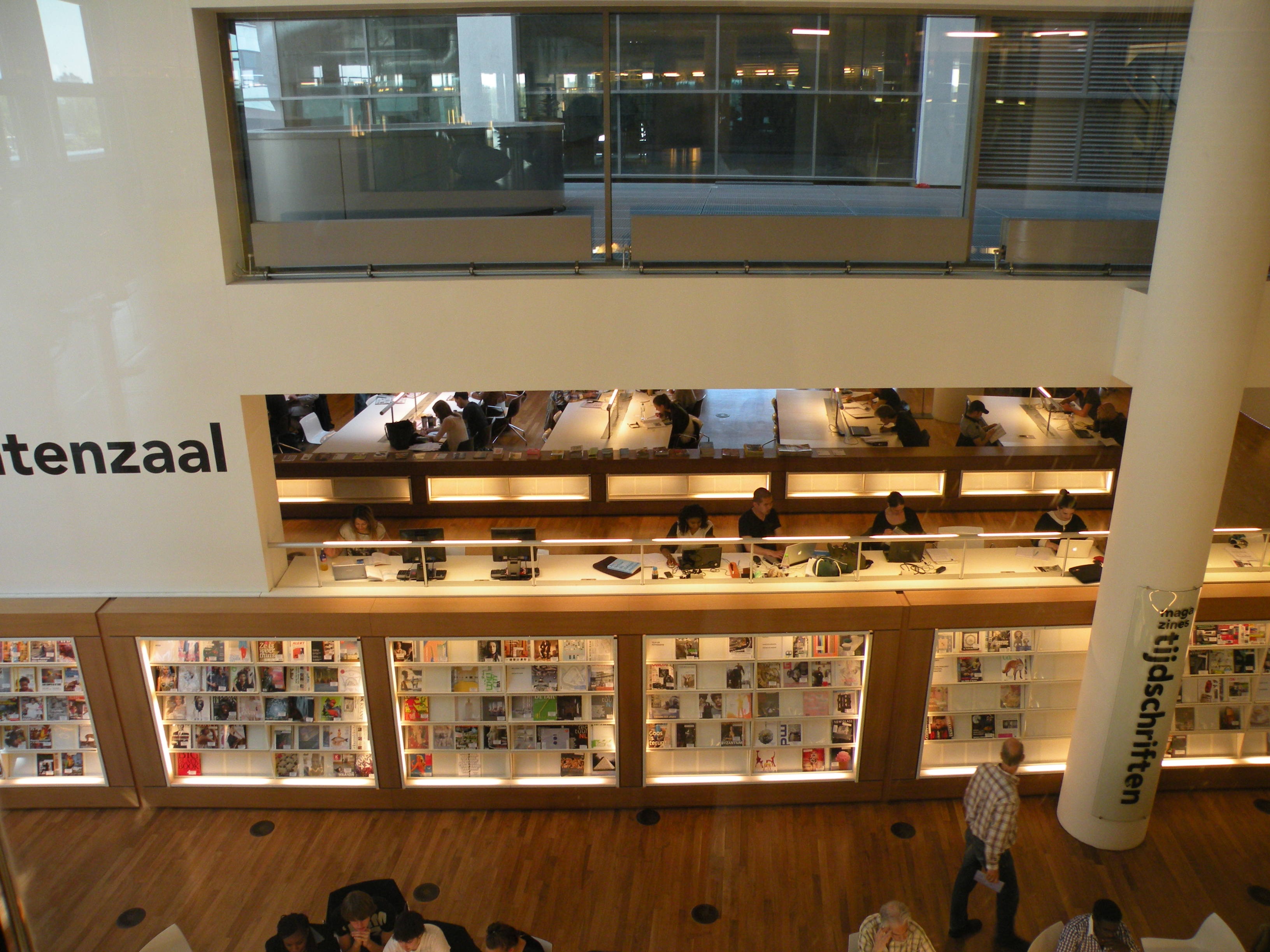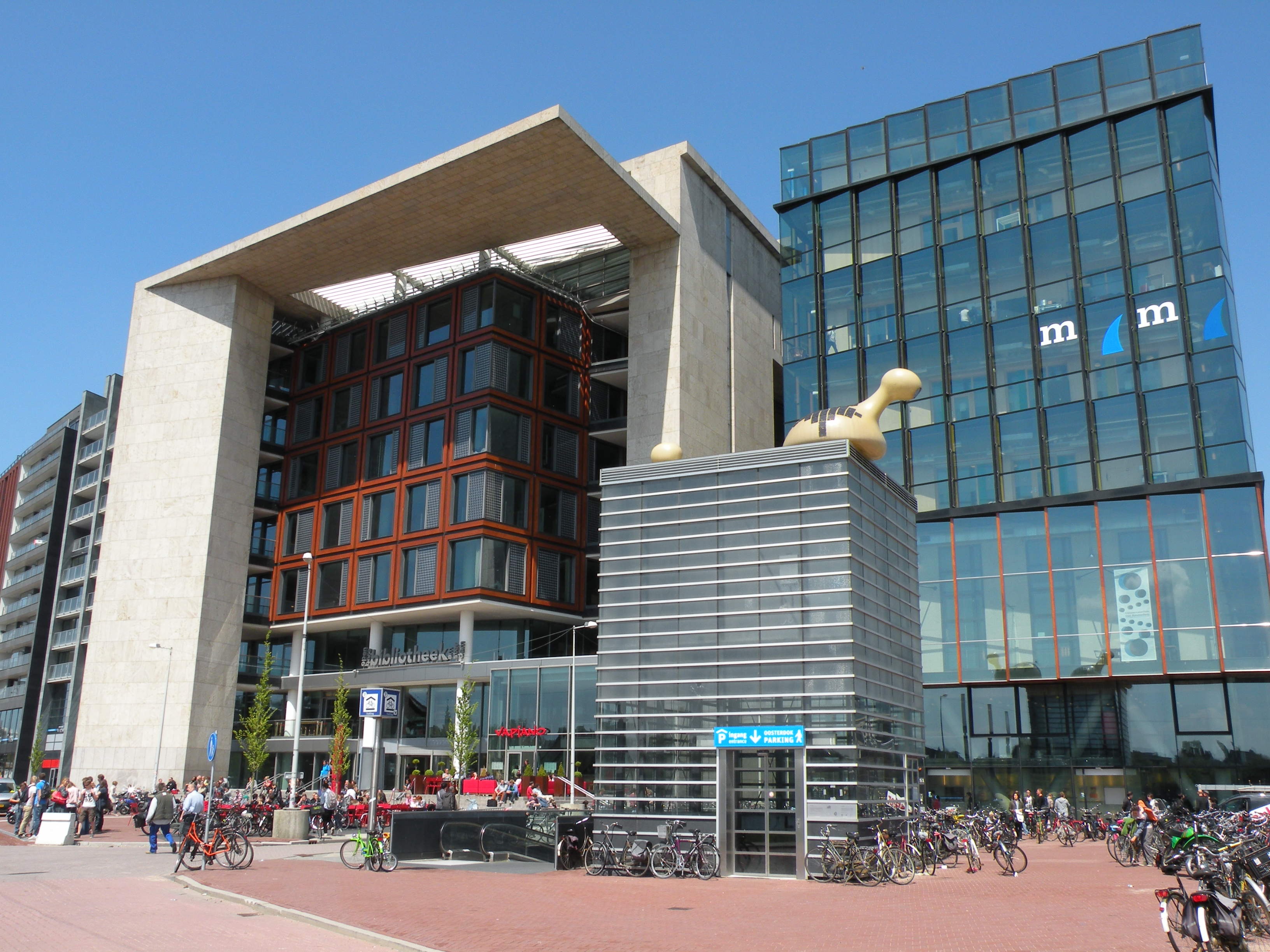 The OBA (Openbare Bibliotheek Amsterdam) Central Library in Oosterdockseiland opened in July 2007 and was designed by Jo Coenen. With an area of 28,000 square meters, it is the largest library in the Netherlands.