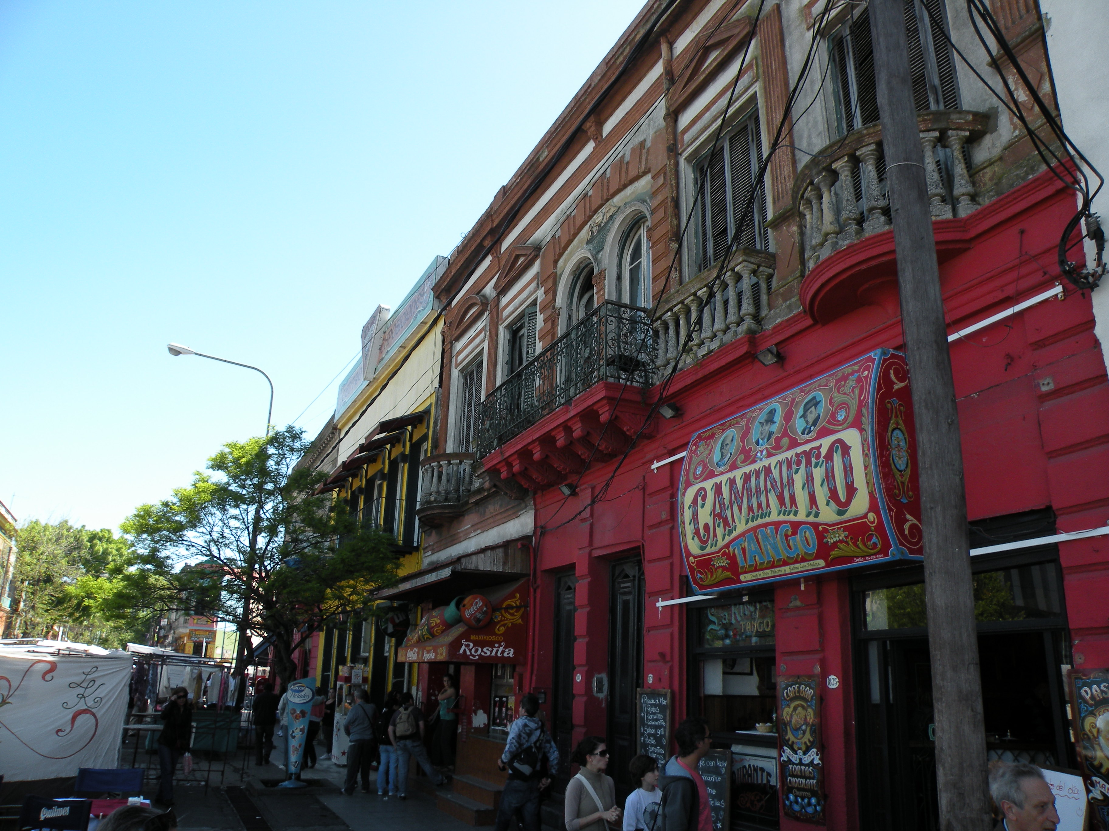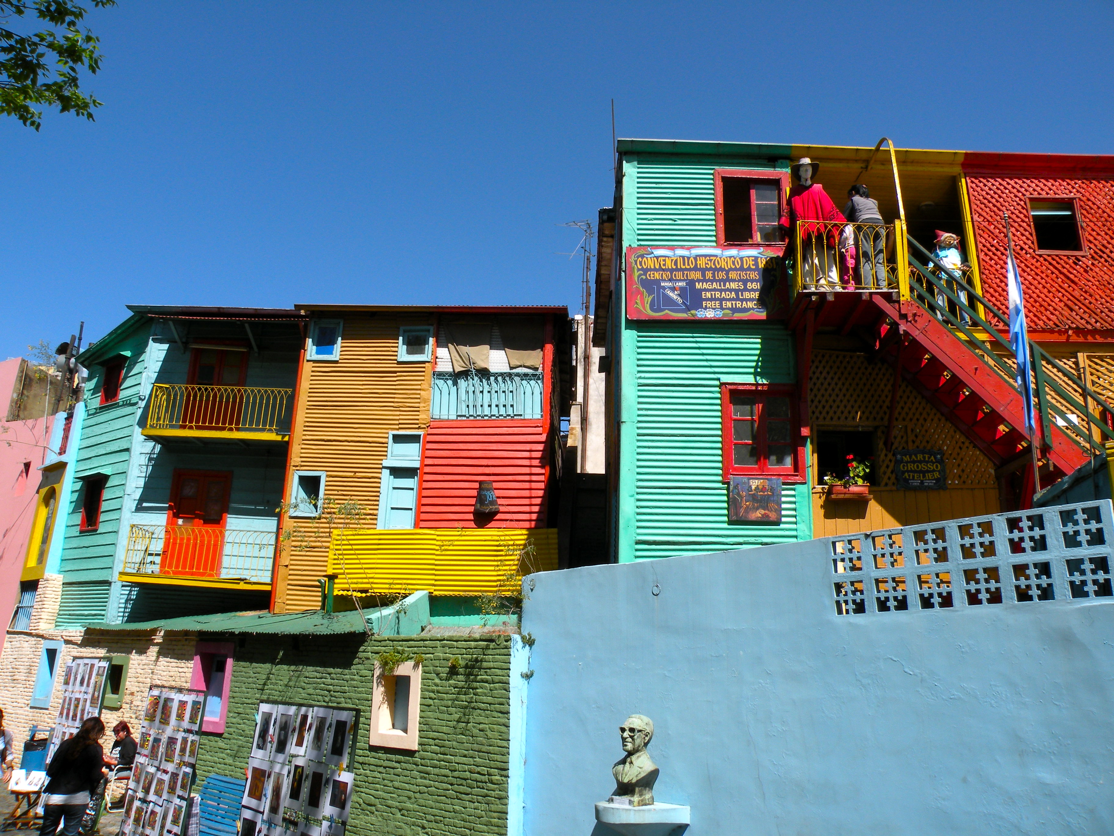 The barrio (or neighbourhood) of La Boca originally developed as a trading post and shipyard and was the entry point of Genoese settlers from Italy at the end of the 19th century. The centre of this barrio is El Caminito, a pedestrian walkway lined with sculpted statues and murals. Surrounding the cobblestone street are houses built with corrugated metal and painted in an assortment of vivid colours, recalling a time when the locals utilized left over paint from the shipyard.