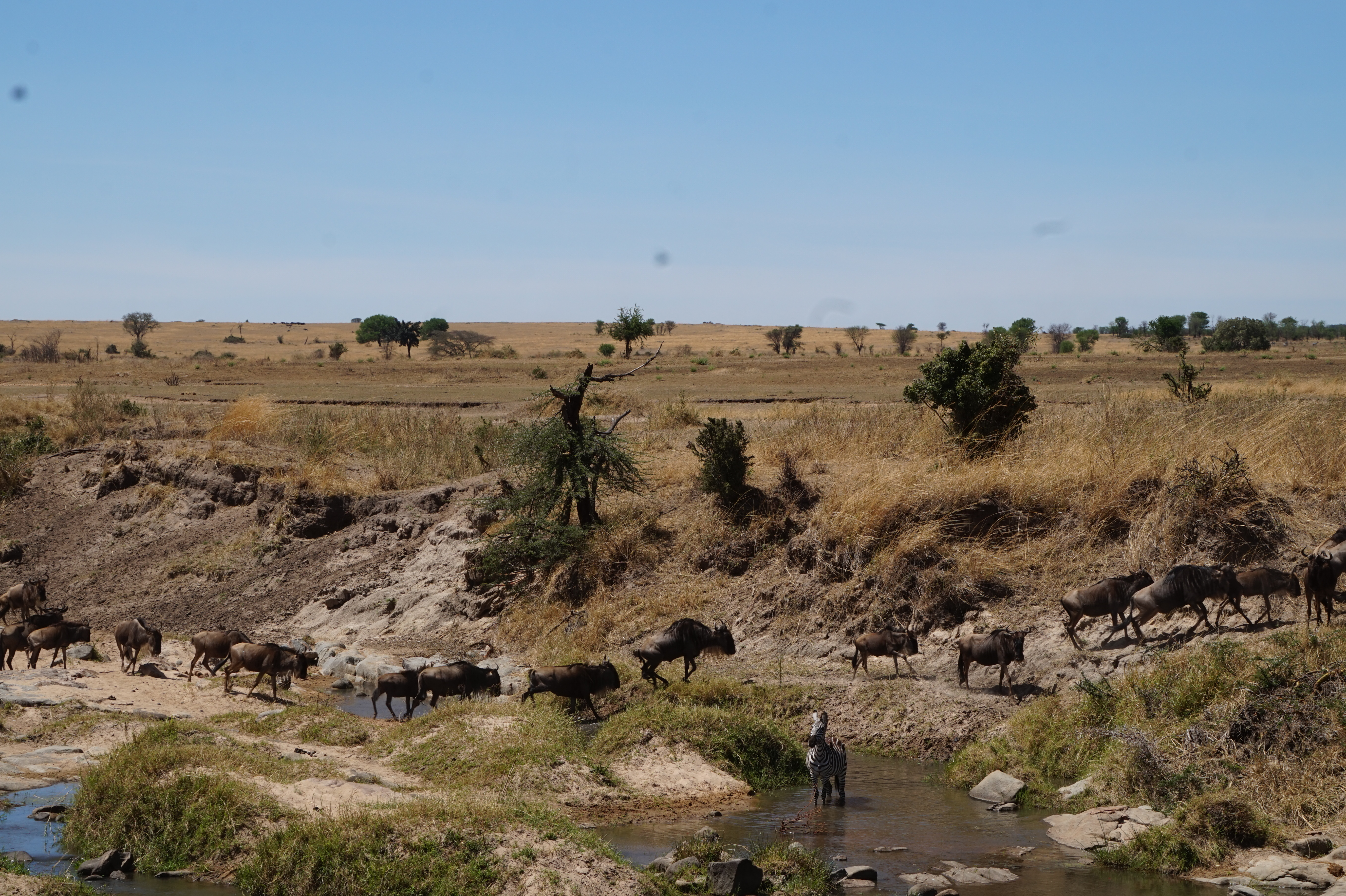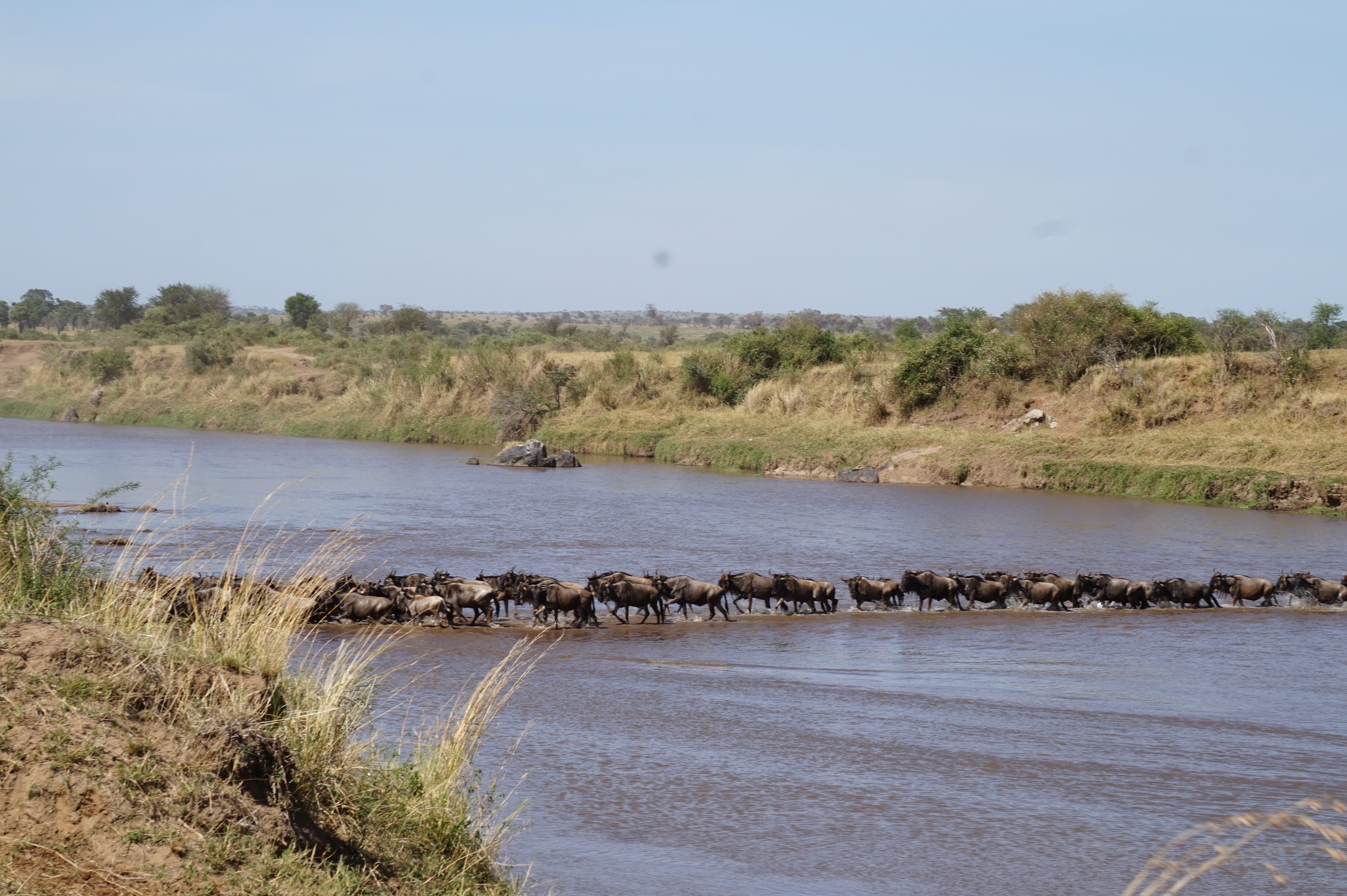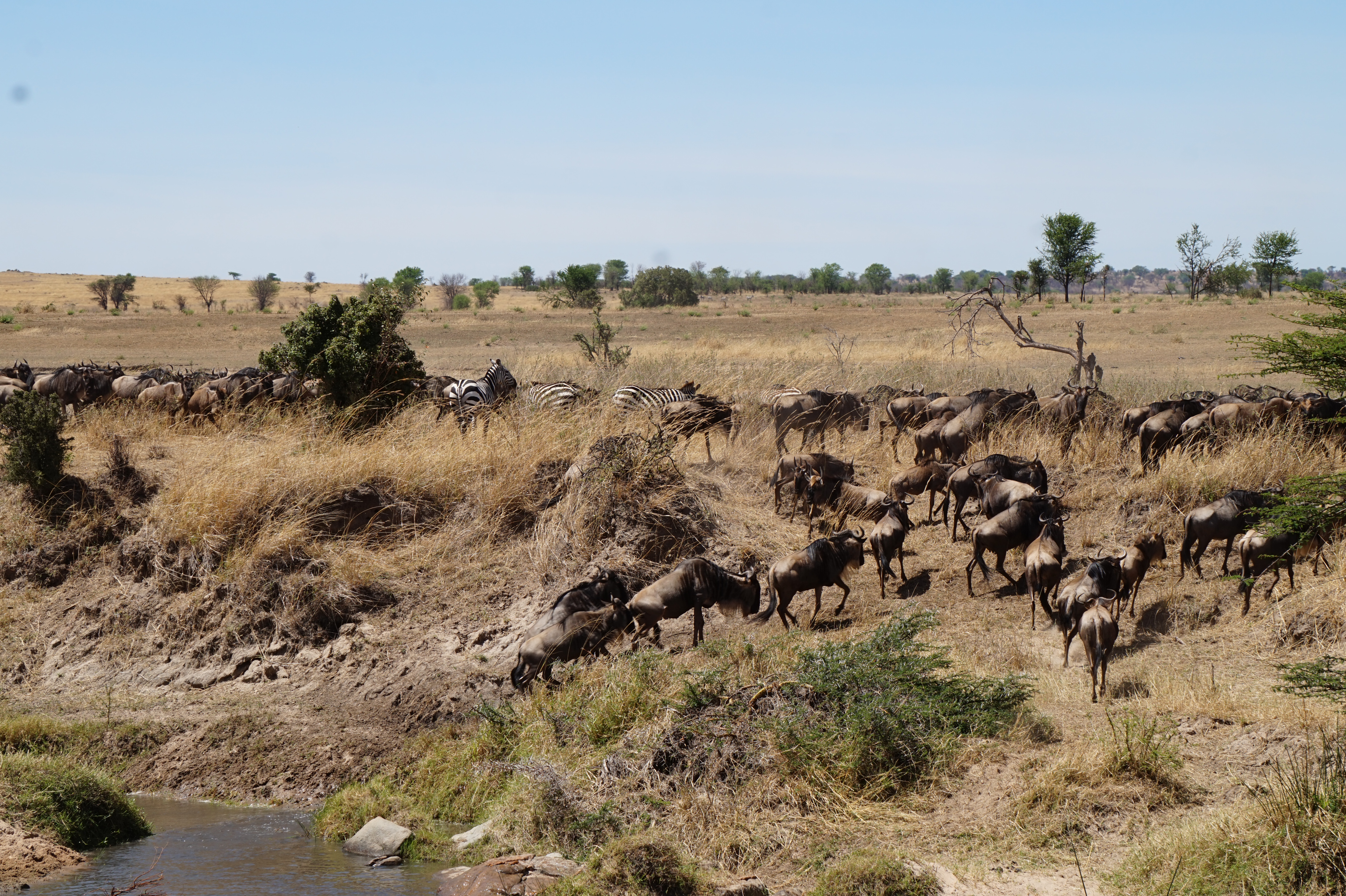I witnessed another river crossing, but through a narrower river, with zebras coming along.