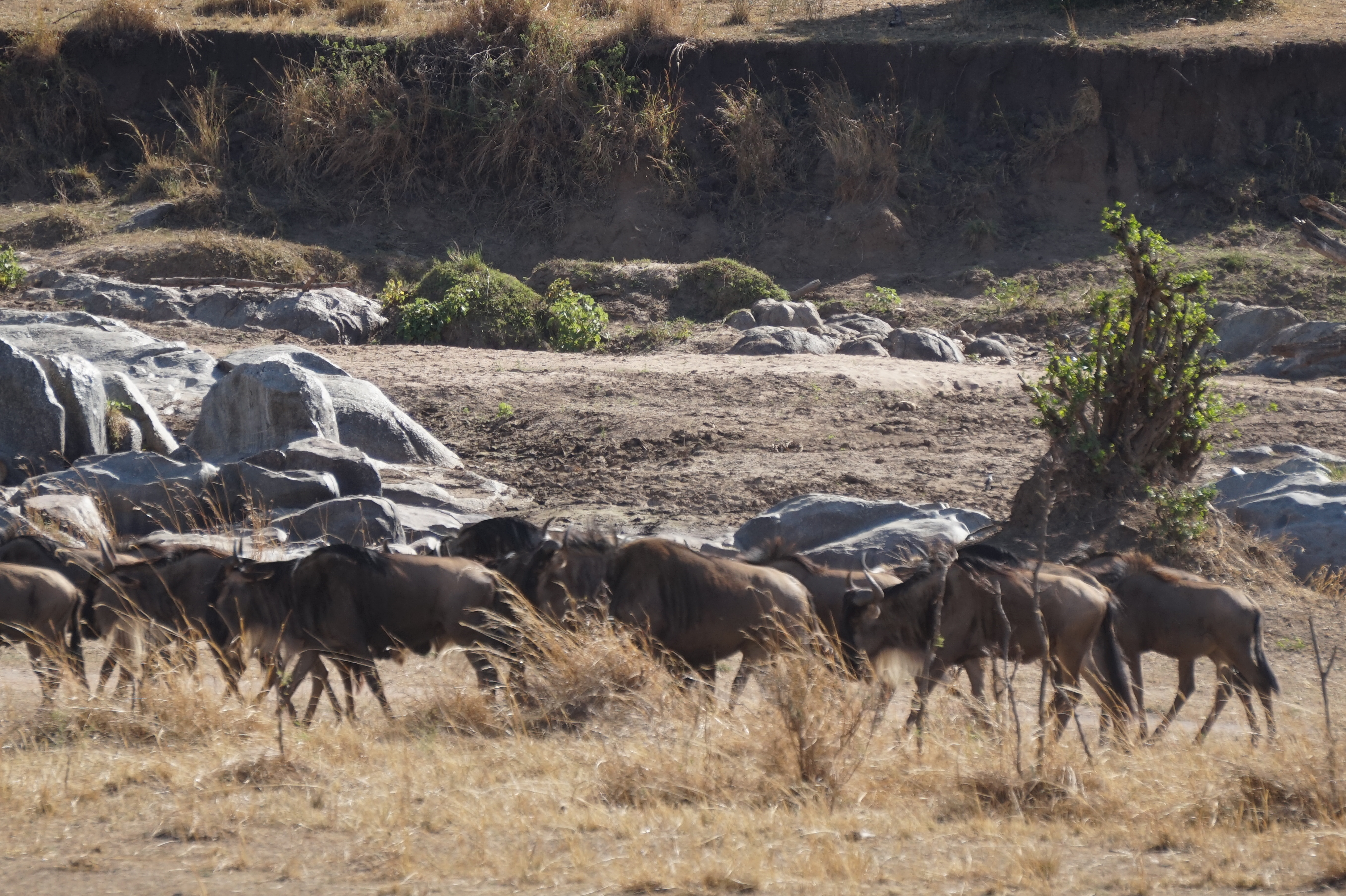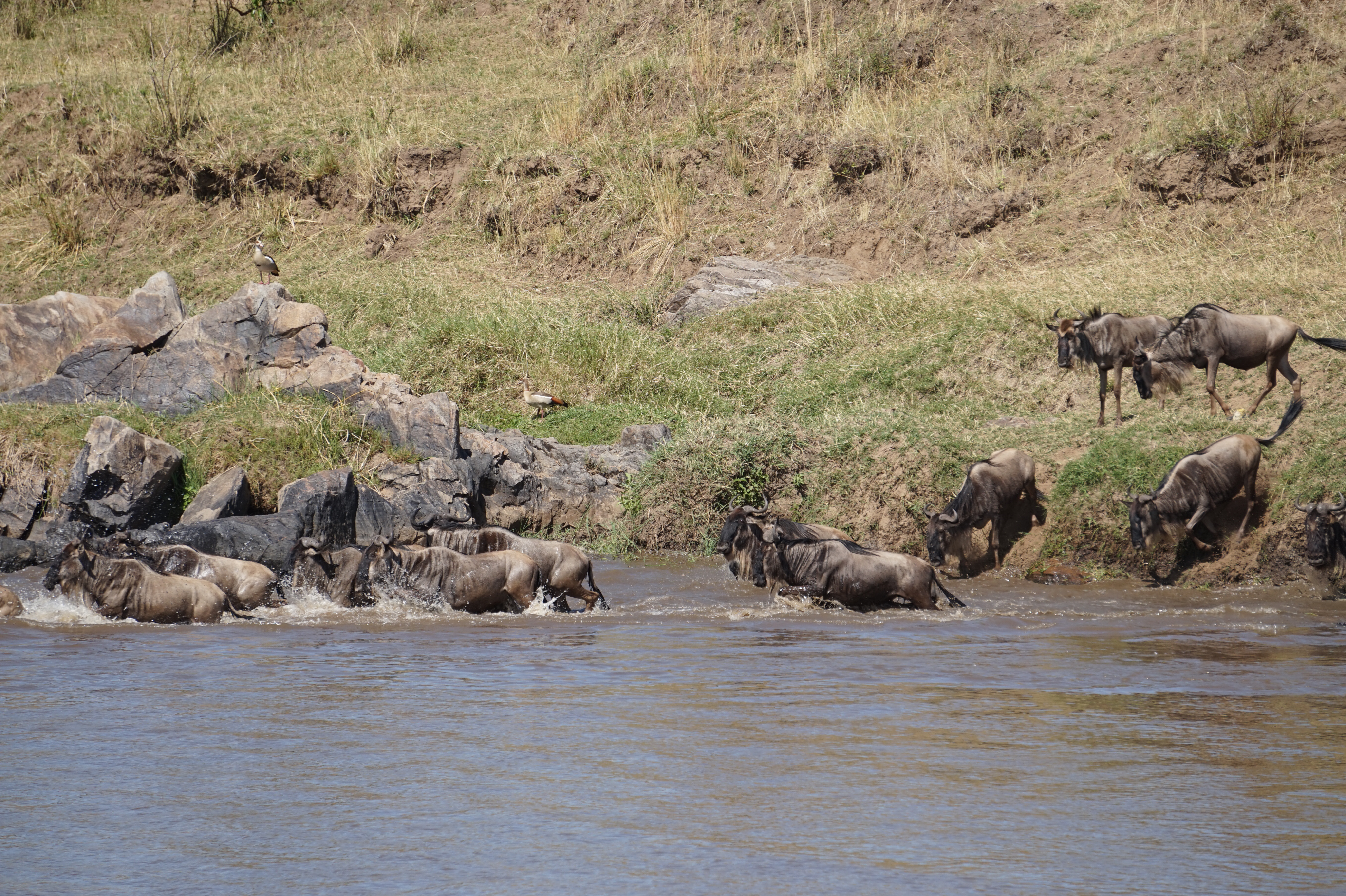The first Mara River crossing I witnessed was spectacular. We waited for four hours as the wildebeest debated whether to cross or not and at which crossing point (there are eleven). There were several false starts, but once they got going, the show is on! All it takes are two or three to lead the herd.
