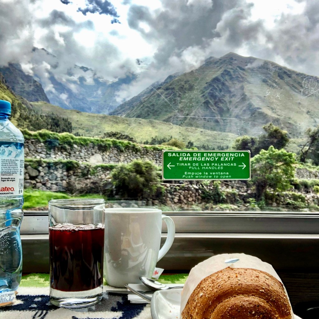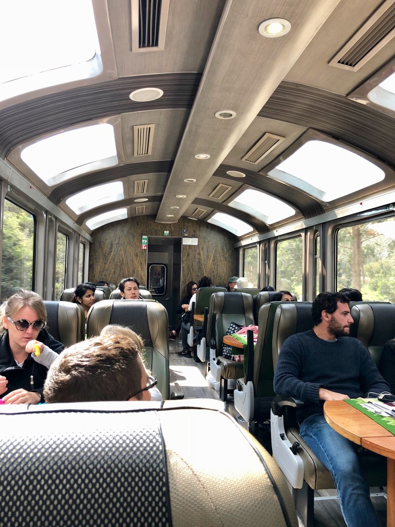 Peru Rail offers the hour and half train ride from Ollantaytambo to Aguas Calientes (or now called Machu Pichu Pueblo). The Vistadome train was a comfortable option (as opposed to doing a 2 or 4 day Inca trail hike) which provided for a scenic ride, with refreshments served on board. From Agua Calientes, one takes a 20-minute bus ride to the gate of Machu Pichu.